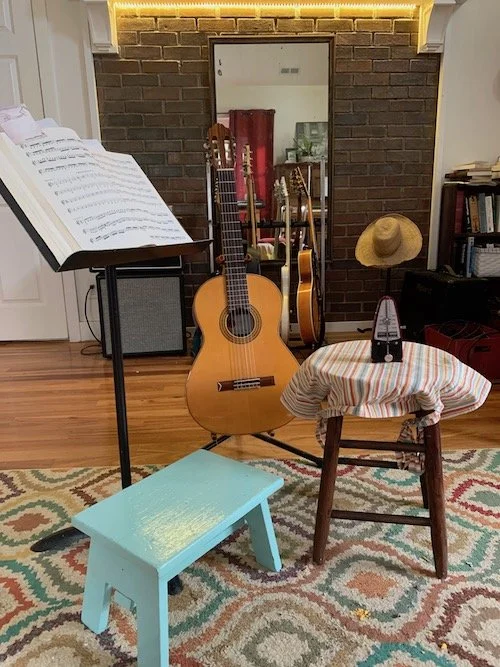 This "overcrowding business" is something I struggle with in my music life also. I allow too much unused gear into my immediate practice space, and it ends up becoming a distraction. Also, when I record something, I am tempted to add more tracks than necessary. Even when coming up with a practice outline, I cram in way too many topics. Thank goodness, one day, the solution came, seemingly out of the blue. I had stumbled across Aaron Shearer’s Scale Pattern Studies For Guitar. In that moment, I decided to finish this dense book by practicing 1hr a day from it on my acoustic nylon string guitar. I don't know why, but it has worked well, and I am very grateful to have received such a simple “less is more” epiphany. One acoustic guitar, one method book and one hour worth of daily practice was the simple “jumpstart” formula that needed.